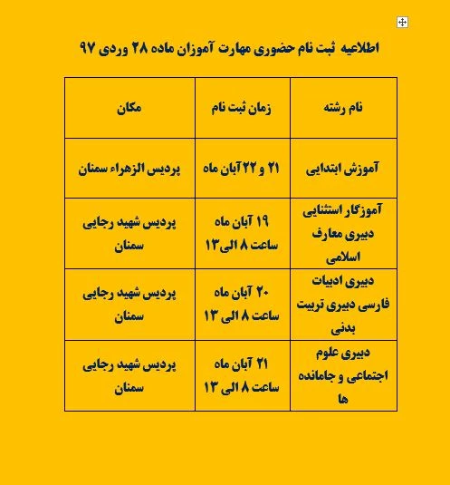 به اطلاع کلیه مهارت آموزان پذیرفته شده سال 1397 می رساند زمان و مکان ثبت نام ضمیمه می باشد و برنامه های کلاسی نیز متعاقبا اعلام می گردد.