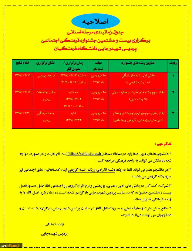 امتیاز دهید : تمدید زمان ثبت نام و برگزاری بیست و هشتمین جشنواره فرهنگی دانشگاه فرهنگیان 2 شنبه 18 فروردین 1397 ساعت 14:46