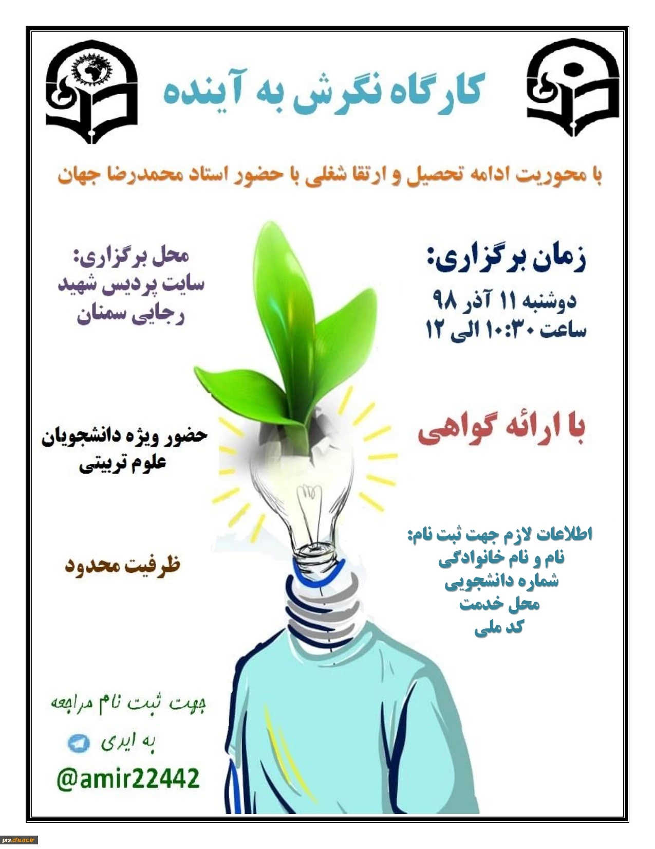 کارگاه نگرش به آینده با حضور استاد محمدرضا جهان در سایت پردیس روز دوشنبه 11 آذر ساعت 10.30 الی 12 برگزار خواهد شد.برای دانشجویانی که در این کارگاه شرکت کنند گواهی صادر می شود.ظرفیت کارگاه محدود است. جهت ثبت نام مشخصات خود را به آیدی amir22442@ بفرستید.